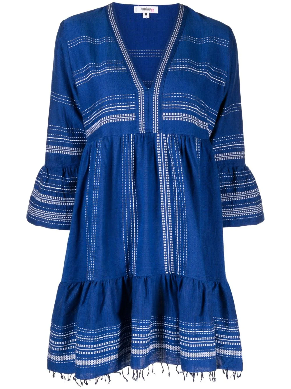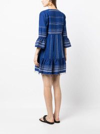 frayed-hem cotton dress Highlights - Sapphire blue - Off-white - Cotton - Horizontal stripe pattern - Vertical stripe pattern - Pleat detailing - V-neck - Three-quarter length sleeves - Flared skirt - Frayed hem Imported Composition Cotton 100% SIZE & FIT Model measurements Height 5 ft 11 in(1.8 m) Bust/Chest 28.34 in(72 cm) Hips 35.43 in(90 cm) Waist 23.62 in(60 cm)