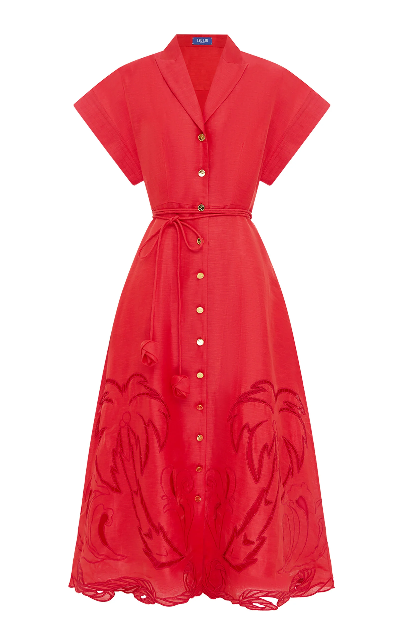 PRODUCT DETAILS - Lapel collar, button-front, applique, midi hem - Button fastening through front - Lined - Composition: 92% Linen 8% Nylon / Lining: 100% Cotton - Color: Scarlet - Dry clean - Resort '26