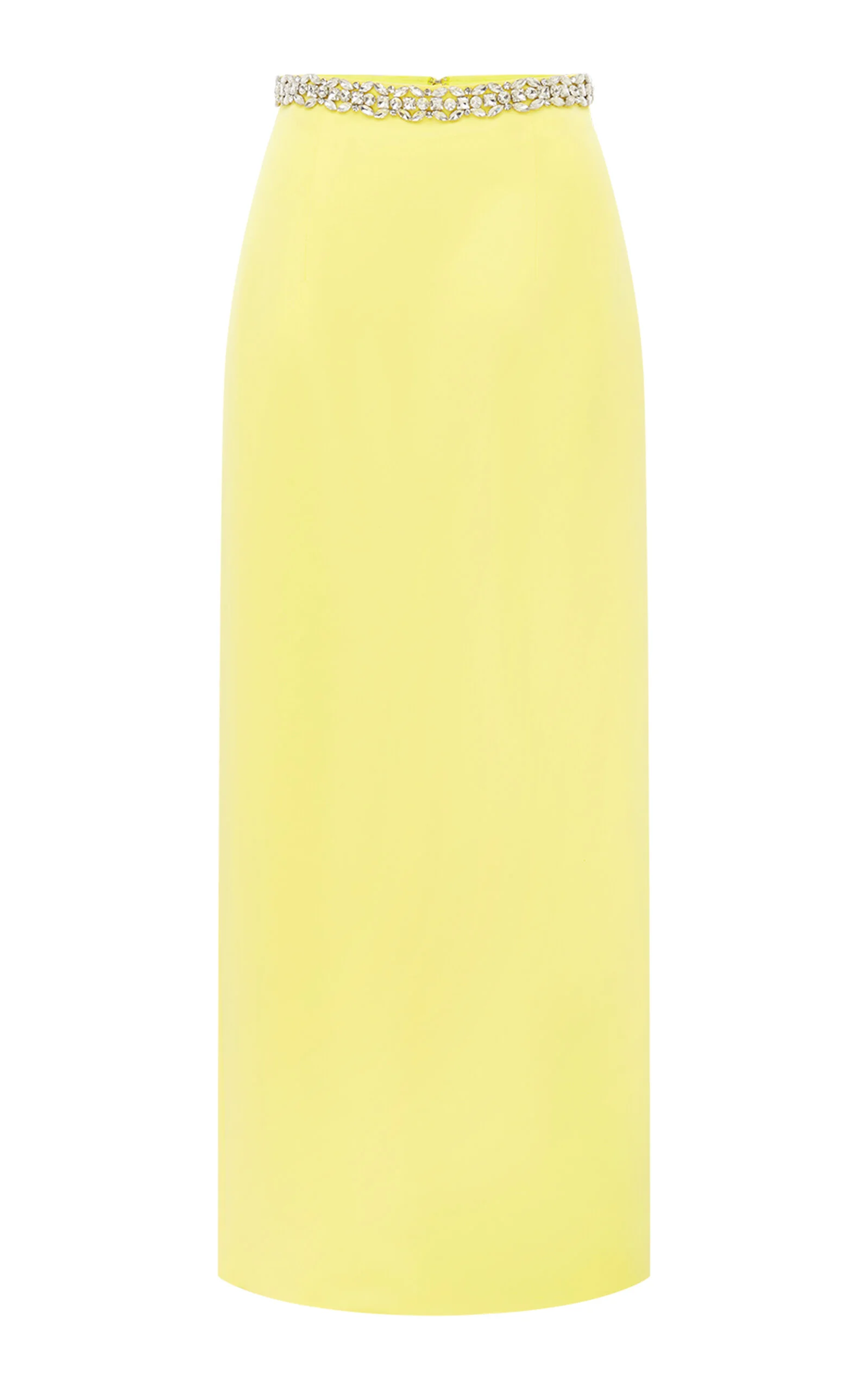 Launched in 2017, Sydney-based Leo Lin's range of stunning gowns and artful cocktail attire has become synonymous with strong femininity, superior craftsmanship and luxury sensibilities. The 'Kyra' skirt has a slim column silhouette made from 'Sunshine' satin with a crystal-embellished waist that sits high above the hip. Complete the look with the Lucia top. PRODUCT DETAILS - Spring '26 - Zipper fastening - Composition: 100% Polyester; Lining: 100% Polyester - Designer color: Sunshine - Dry clean only - Imported