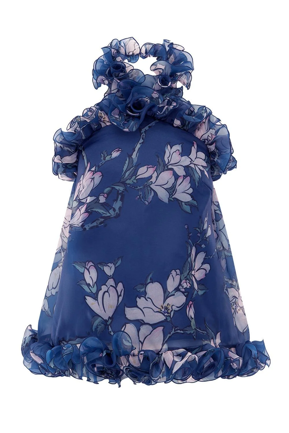 DETAILS AND INSIGHT Leo Lin michelle ruffled halterneck top in midnight magnolia print. 100% Polyester / Lining: 100% Polyester Dry Clean Made In China Style LLRE26046-MIDNIGHT MAGNOLIA