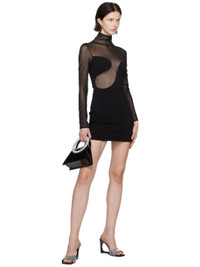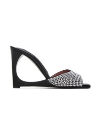 Satin slip-on heeled sandals in black. · Open square toe · Crystal-cut accents at vamp · Logo patch at padded footbed · Buffed leather lining · Cutout at wedge heel · Leather sole with rubber injection · Heel: H3.75 in Supplier color: Crystal/Strass/Crystal Upper: textile. Sole: leather, rubber. Made in Italy 232855F125003