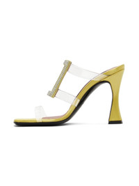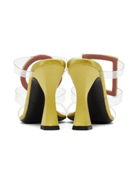 Satin slip-on heeled sandals in green. · Open square toe · Transparent PVC straps · Crystal-cut accents at vamp · Logo patch at grained sheepskin footbed · Covered stiletto heel with rubber injection · Buffed calfskin sole · Heel: H4 in Supplier color: Lime Upper: textile, polyvinyl chloride, sheepskin. Sole: calfskin. Made in Italy 221855F125001