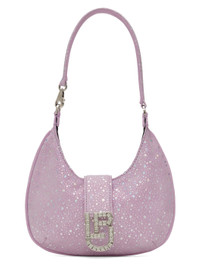 Calfskin suede shoulder bag in purple. Lame detailing throughout. · Partially detachable shoulder strap · Crystal-cut logo hardware at face · Foldover tab with magnetic closure · Card slot at interior · Buffed leather lining · Logo-engraved silver-tone hardware · H5 x W8 x D1.5 in Supplier color: Moon lilac Calfskin. Made in Italy 231855F048001