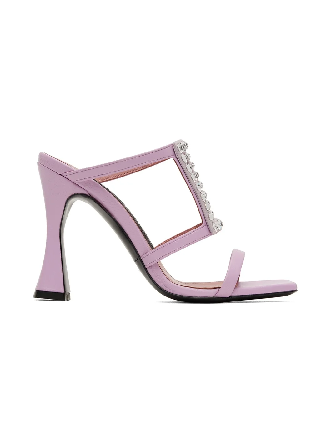 Grained nappa calfskin heeled sandals in purple. · Open square toe · Crystal-cut graphic applique at vamp · Logo patch at padded footbed · Covered heel with rubber injection · Leather outsole · Heel: H3.75 in Supplier color: Lilac Upper: calfskin. Sole: leather. Made in Italy 231855F125004