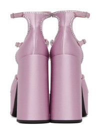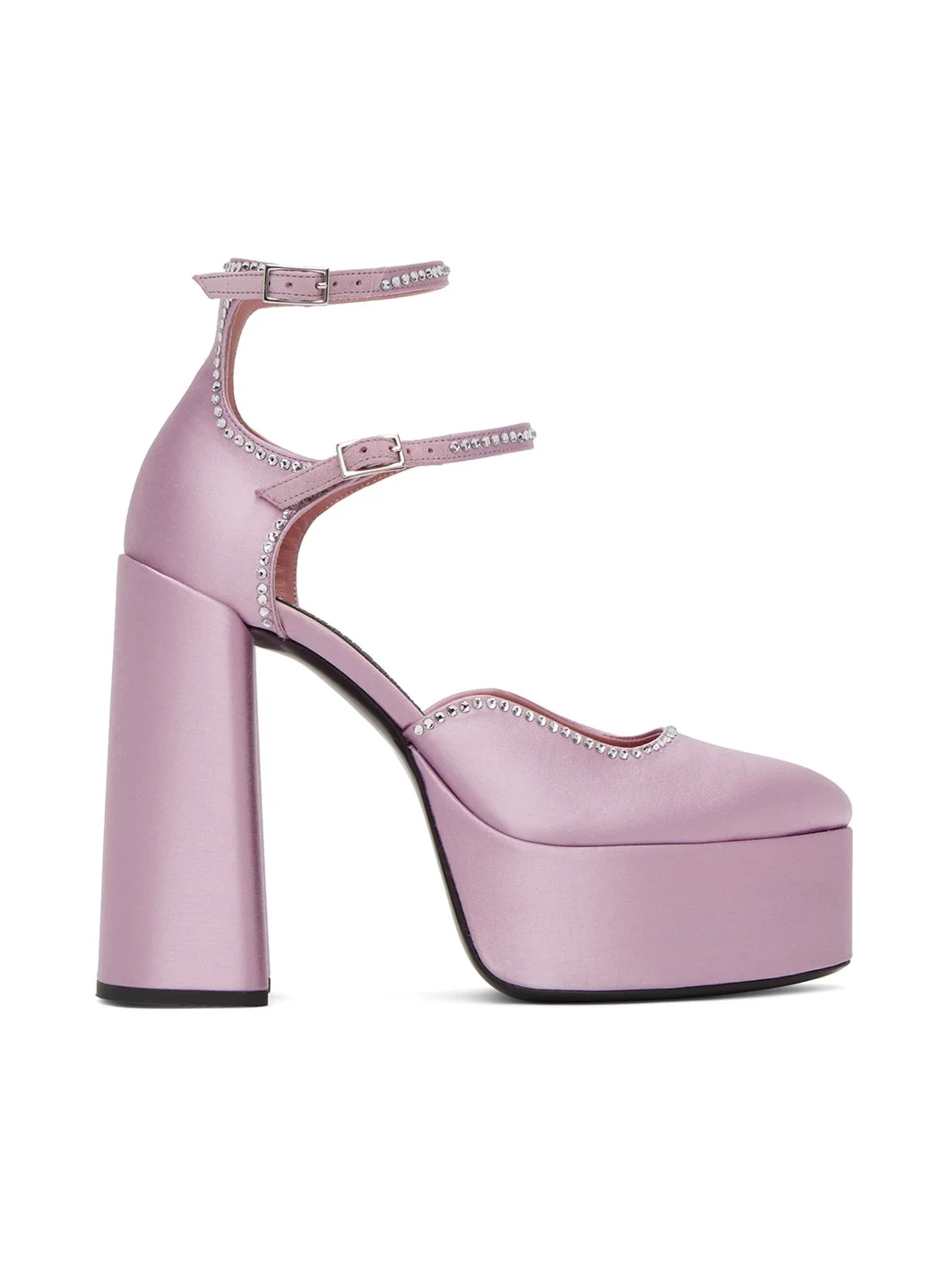 Satin heels in purple. Crystal-cut accents throughout. · Pointed toe · Cutout at vamp · Adjustable pin-buckle ankle straps · Logo patch at padded footbed · Covered block heel with rubber injection · Covered platform midsole · Buffed calfskin outsole · Platform: H1.5 in · Heel: H5 in Supplier color: Glycine Upper: textile. Sole: calfskin. Made in Italy 222855F122000
