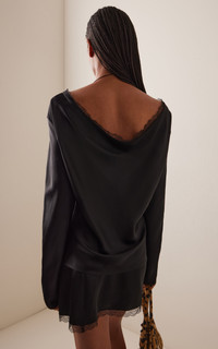 Founded by Lili Chemla, Leset is devoted to making irresistible casual essentials that are clean, modern and always enjoyable to wear. Whether it's day or night or somewhere in between, the LA-based brand's loungewear pairings elevate versatility to new heights. Cut from the label’s Japanese-crafted ‘Barb’ satin, this blouse has a subtle boat neck that leads to a cowled open-back, further defined by delicate lace. It fits loosely over the frame, falling to the hip to meet the matching mini skirt. PRODUCT DETAILS - Fall/Winter ‘25 - Slip on - Composition: satin, lace - Dry clean - Imported
