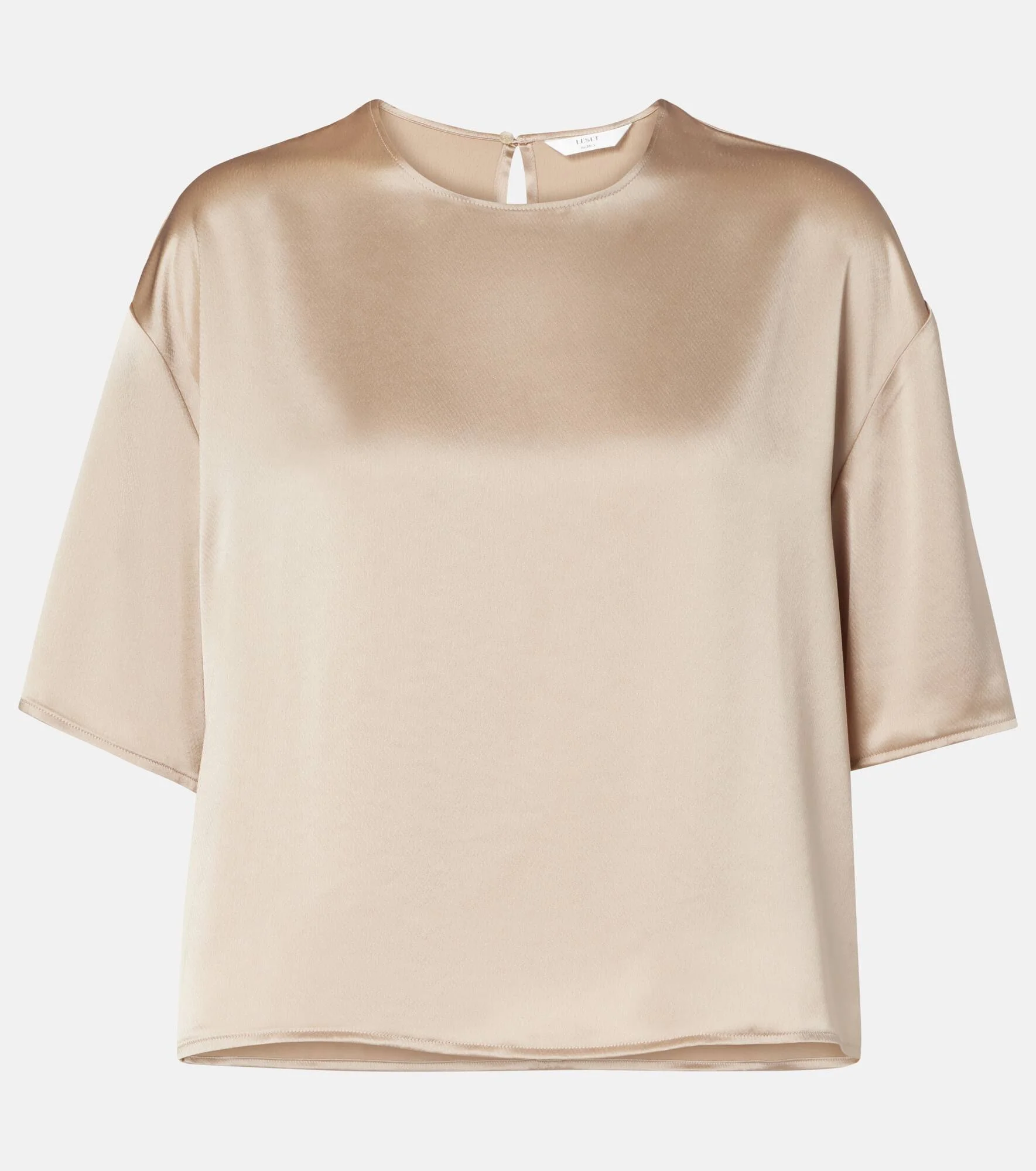The boxy cut and the satin construction of the Barb T-shirt from Leset make it a breezy but elegant choice for your daily outfits. The slightly cropped design has a partially opened back. Product Details - Material: 75% acetate, 25% polyester - Care instructions: dry clean - Made in the USA - Designer color name: Sand - Item color: beige - Closure: button fastening - Item number: P01069380 Size & Fit - True to size - Dropped shoulders - Designed for a loose fit - Non-stretchy fabric - Slightly cropped - The model seen in the picture is 178cm-5'10" and wearing a size XS