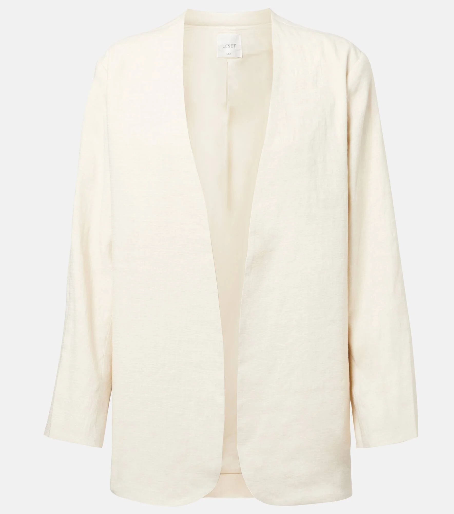 Crafted from a linen-blend, the Belle jacket from Leset showcases a collarless style with an open front. This design features dropped shoulders and is cut to an oversized silhouette. Product Details - Material: 54% linen, 45% viscose, 1% elastane - Care instructions: dry clean - Made in the USA - Designer color name: Oat - Item color: white - Lining: 100% silk - Collarless - Item number: P01040266 Size & Fit - True to size - Designed for a loose fit - Non-stretchy fabric - Falls below the hip - The model seen in the picture is 178cm-5'10" and wearing a size XS