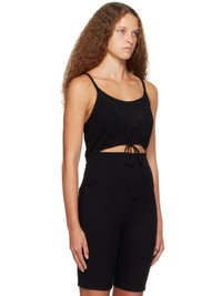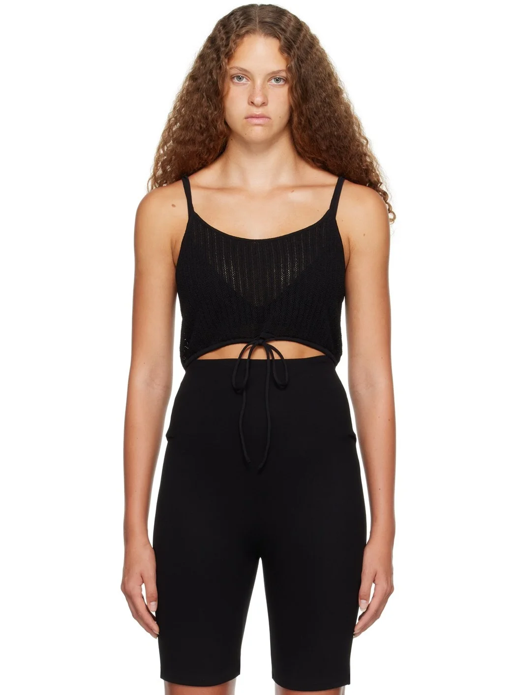 Semi-sheer pointelle knit viscose- and nylon-blend tank top. Rib knit trim throughout. · Scoop neck · Self-tie drawstring at elasticized hem · Adjustable spaghetti straps Supplier color: Black 65% viscose, 35% polyamide. Made in China 231793F111024
