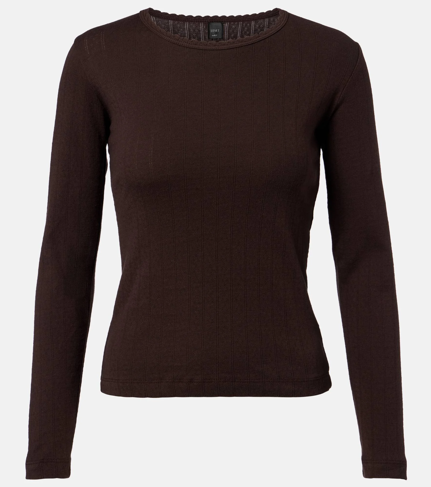 This T-shirt from Leset is crafted from soft cotton with a pointelle pattern. The long-sleeved design comes in a brown hue and features a classic crew neckline and scalloped edging. Product Details - Material: 100% cotton - Care instructions: hand wash cold - Made in the USA - Designer color name: Choco - Item color: brown - Collar: crewneck - Hem: scalloped - Item number: P01123129 Size & Fit - True to size - Fitted - Stretchy fabric - Falls to the hip - The model seen in the picture is 178cm-5'10" and wearing a size XS
