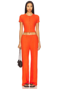 - 47% polyester 47% viscose 6% spandex - Hand wash - Pull-on styling with elastic waistband - Side seam pockets - Midweight brushed knit jersey fabric - Item not sold as a set.18" at the knee and 18" at the leg opening - Revolve Style No. LSET-WP22 - Manufacturer Style No. LB134B-LAUREN