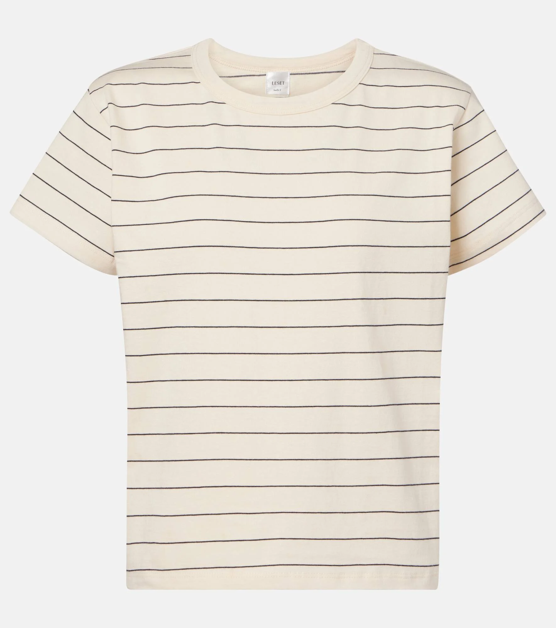 The Margo is the most-loved T-shirt from Leset's collection of everyday essentials. Made from pure cotton jersey, the striped, crewneck piece is subtly cropped and has a slightly boxy silhouette. Product Details - Material: 100% cotton - Care instructions: machine wash cold - Made in the USA - Designer color name: Natural/Midnight Stripe - Item color: beige, blue - Collar: crewneck - Item number: P01069518 Size & Fit - True to size - Straight fit - Slightly stretchy fabric - Falls to the hip - The model seen in the picture is 178cm-5'10" and wearing a size XS