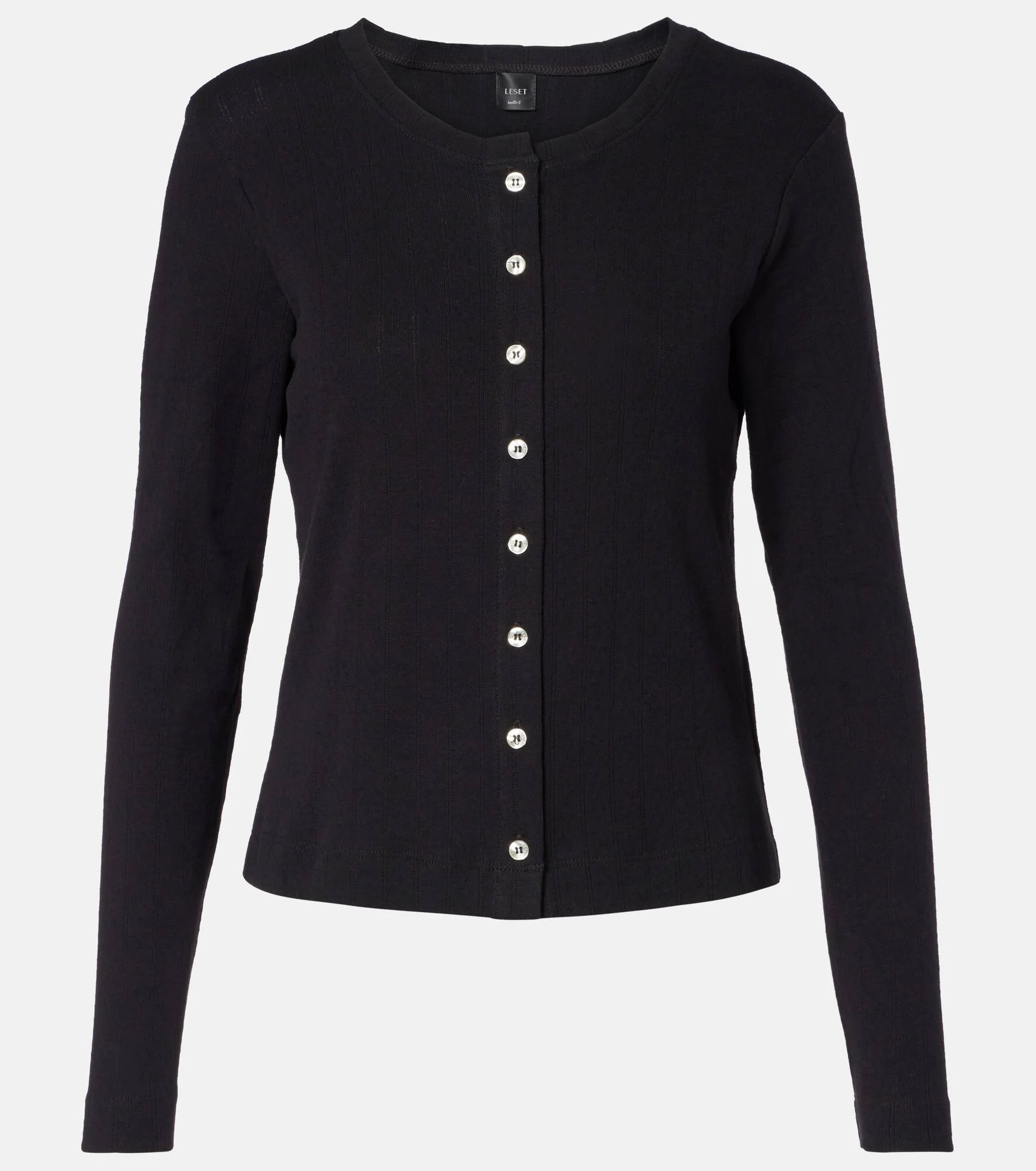 The Pointelle cardigan from Leset is named after its delicate openwork knitted pattern. The piece is made from pure cotton and has an open-front, long-sleeved silhouette. Product Details - Material: 100% cotton - Care instructions: hand wash - Made in the USA - Designer color name: Black - Item color: black - Closure: buttoned placket - Collar: crewneck - Item number: P01069362 Size & Fit - True to size - Straight fit - Stretchy fabric - Falls to the hip - The model seen in the picture is 178cm-5'10" and wearing a size XS