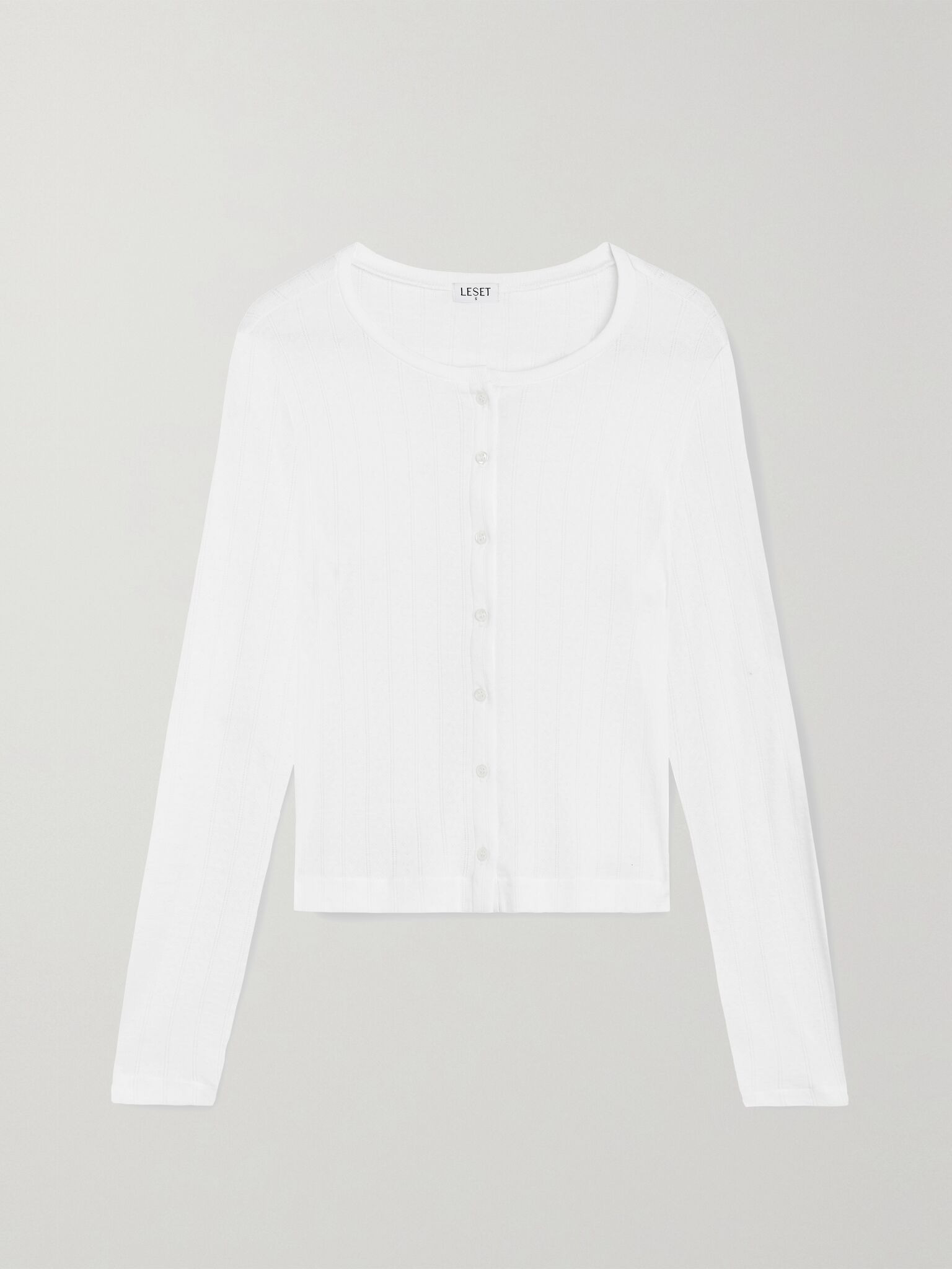 LESET's versatile white cardigan works just as well layered over the matching T-shirt or a patterned dress. It's made from pointelle-knit cotton-jersey for a slim fit and has a soft, lightweight handle, making it ideal for warmer days. Style it with a few of the lustrous buttons undone at the hem. Size & Fit - Fits true to size, take your normal size - Designed for a slim fit - Lightweight knit - Model is 180cm/ 5’11” and is wearing a size Small Details & Care - White pointelle-knit cotton-jersey - Button fastenings through front - 100% cotton