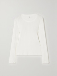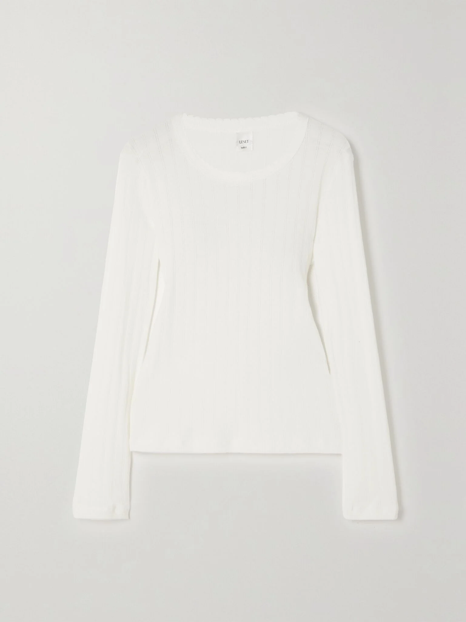 LESET collections are the building blocks of a capsule wardrobe that's "simple, intuitive, and cohesive." This top is pointelle-knitted from exceptionally soft cotton-jersey and has a delicately scalloped neckline. Style yours with jeans and a chunky knit on weekends. Size & Fit - Fits true to size, take your normal size - Designed for a slim fit - Mid-weight, stretchy fabric - Model is 177cm/ 5'10" and is wearing a size Small Details & Care - White cotton-jersey - Slips on - 100% cotton - Hand wash