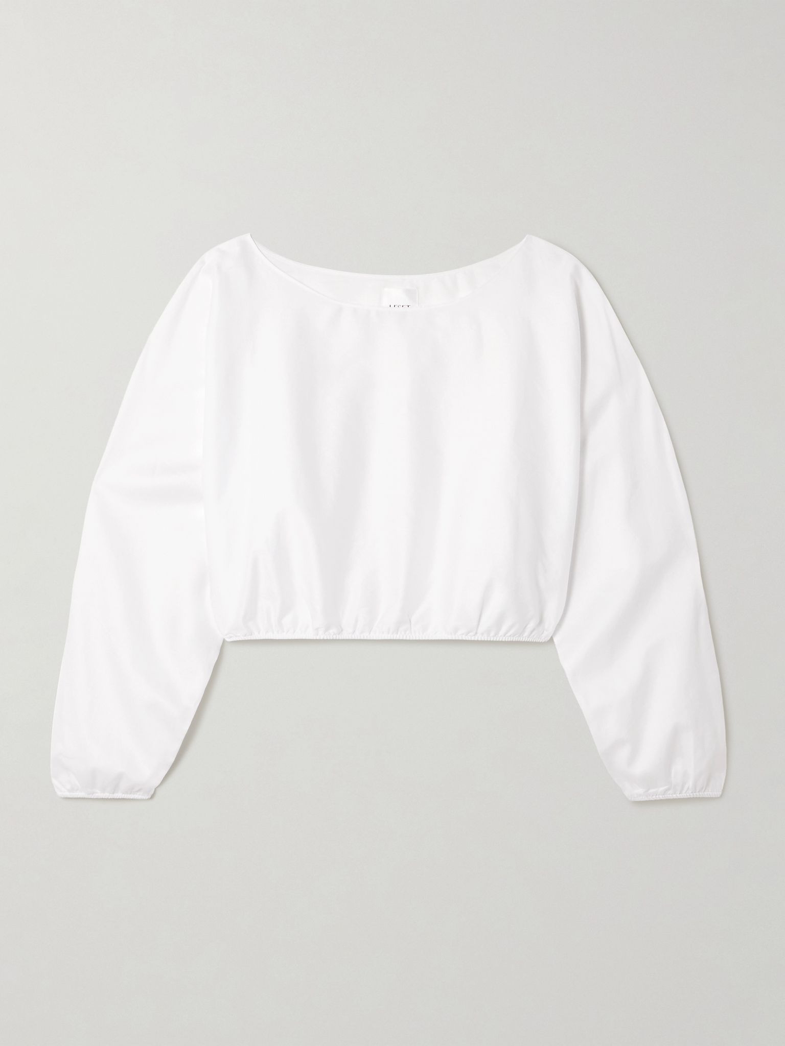 LESET's 'Yoko' top has been made in LA from cotton-poplin, which feels "just like perfectly lived in bed sheets", according to the label. It has an elegant boat neckline and a billowy, cropped shape with an elasticated cuffs and hem. Wear yours as a set with the matching pants in our edit. Size & Fit - Fits true to size, take your normal size - Intended for a boxy fit, cut to be worn loose - Cropped length - Elasticated at the hem - Mid-weight, non-stretchy fabric - Model is 180cm/ 5'11" and is wearing a size XSmall Model measurements: - Bust: 80cm/ 31.5" - Waist: 65cm/ 25.5" - Hip: 89cm/ 35" Details & Care - White cotton-poplin - Slips on - 100% cotton - Machine wash