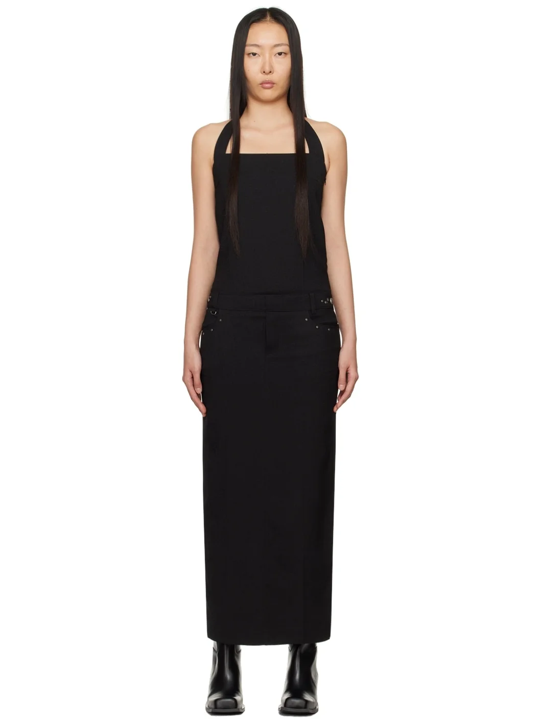Stretch polyester canvas dress. · Square neck · Graphic hardware at front and side seams · Belt loops and D-ring hardware at waist · Welt pockets · Mock-fly · Self-tie halter straps · Concealed zip closure at side seam · Central vent at back hem · Full poplin lining Supplier color: Black Body: 97% polyester, 3% polyurethane. Lining: 100% polyester. Made in South Korea 241732F055003