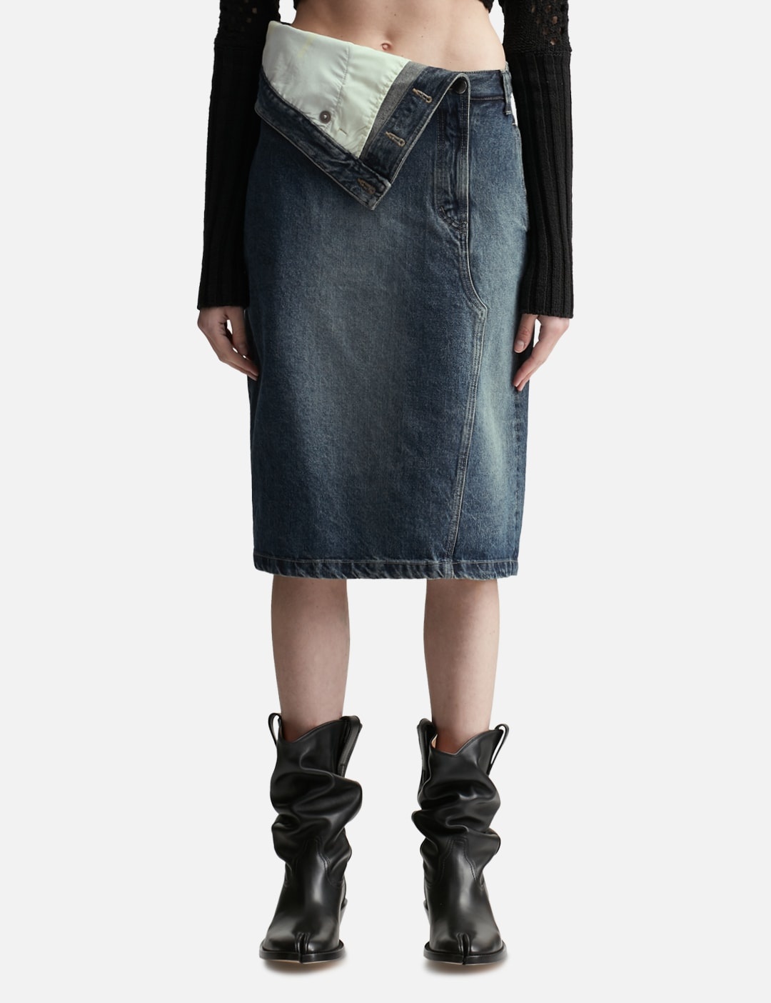 - Lesugiatelier - Folded-waist Denim Midi Skirt - Midi length denim skirt - Asymmetric sash fold design - Design that shows the inside of the pocket on the folded part - Leather logo labeling on the back - Color: Blue - Country Of Origin: KR - Material: 100% Cotton - See more Skirts and Clothing SIZING - Model wears size 1 - Model measures: Height 177cm, Chest 32”/81cm, Waist 23.5”/59.7cm, Hip 33’’/83.8cm