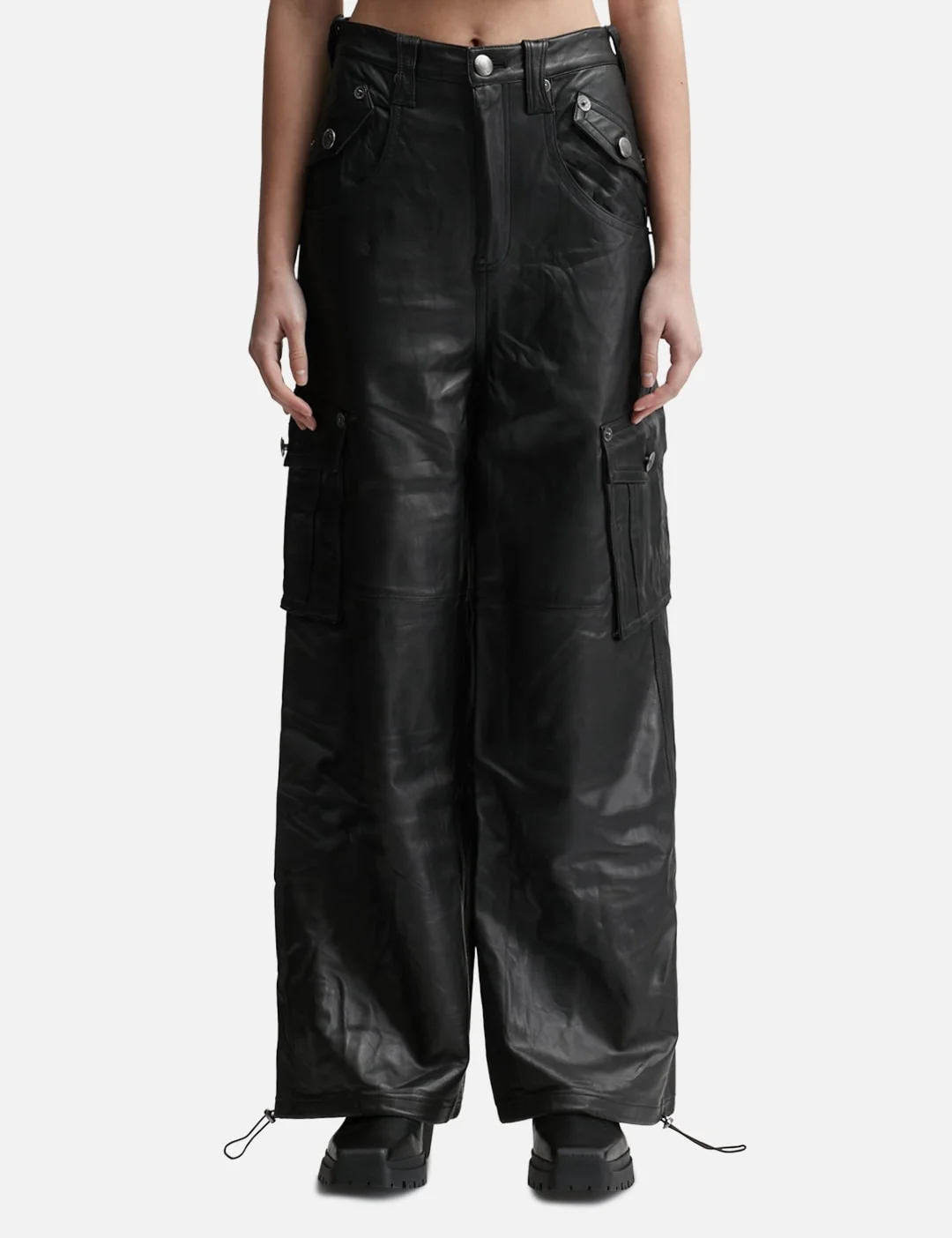 - Lesugiatelier - Leather Cargo Pants - Wide fit - Zip fly with button closure - Handcrafted belt loop design - Handcrafted rivets detail - Tonal and branded hardware - Multiple front flap pockets - Two rear flap pockets - Adjustable drawstring hem - Color: Black - Country Of Origin: KR - Material: 100% Lambskin - See more Pants and Clothing SIZING - Model wears size 26 - Model measures: Height 173cm, Chest 32”/81cm, Waist 23’’/58.42cm, Hip 34”/86.4cm