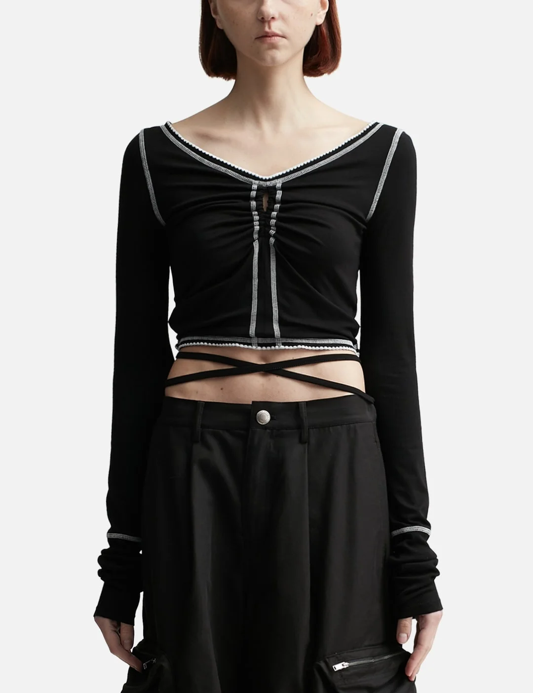 - Lesugiatelier - Shirred Long Sleeve T-shirt - Cropped fit - Stretchy fabric - V-neck - Cut out detailing at front - White trim detailing along neckline, chest, and hem - Shirring decoration on chest - Two long side strings for your styling - Color: Black - Country Of Origin: KR - Material: Rayon 80%, Polyester 20% - See more Tops and Clothing SIZING - Model wears size 1 - Model measures: Height 177cm, Chest 32”/81cm, Waist 23.5”/59.7cm, Hip 33’’/83.8cm