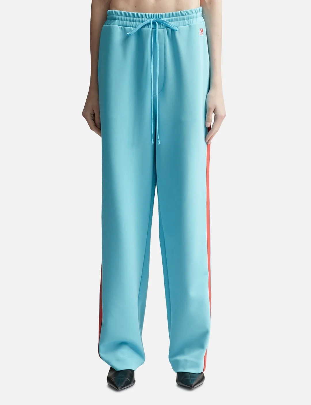 - Lesugiatelier - Side-Stripe Track Pants - Relaxed and wide-fit - UNISEX item - Elastic waistband with cotton drawstring - Side pockets - Signature logo embroidered on the front - Asymmetric side seam cut-out design - Stripes on both sides with contrasting color - Color: Blue - Country Of Origin: KR - Material: Polyester 92% , Polyurethane 8% - See more Pants and Clothing SIZING - Model wears size S - Model measures: Height 177cm, Chest 32”/81cm, Waist 23.5”/59.7cm, Hip 33’’/83.8cm