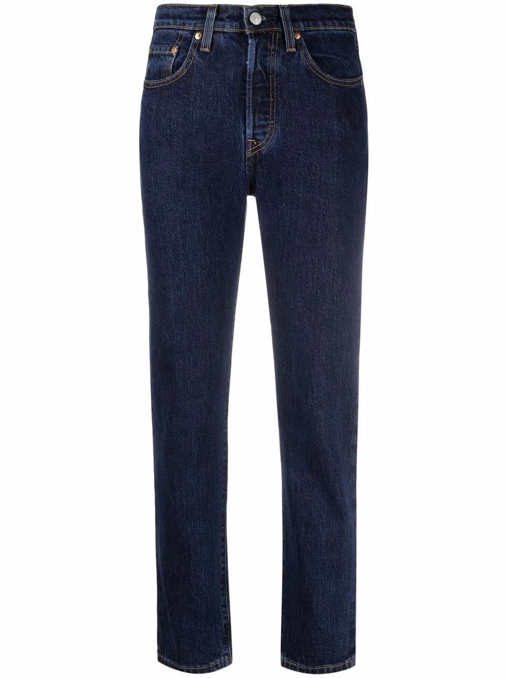 501 straight-leg jeans navy blue cotton blend stretch-design logo patch to the rear belt loops concealed front fastening classic five pockets straight leg Imported Composition Cotton 99%, Elastane 1% SIZE & FIT Model measurements Height 5 ft 9 in(1.75 m) Bust/Chest 31.88 in(81 cm) Hips 34.64 in(88 cm) Waist 22.83 in(58 cm) FittingInformation This piece fits true to size. We recommend you get your regular size Cut for a slim fit Made with a mid-weight stretch fabric Washing instructions Machine Wash