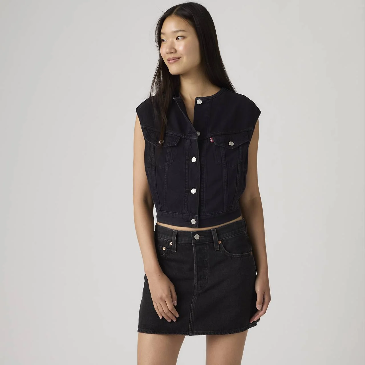 Our iconic '90s Trucker Jacket, made into a vest. We designed our Collarless Shrunken '90s Vest with a laidback, relaxed fit and instantly recognizable Levi's® hardware and chest pockets. - Our Shrunken '90s Trucker Jacket in vest form - Cut with a relaxed fit - Features two chest pockets and two side pockets - Airy. Breathable. Light. This garment is made with lightweight cotton and TENCEL™ Lyocell to keep you looking good and feeling comfortable. TENCEL™ is a trademark of Lenzing AG. Style # 005NP0003 Color: None Your Business Stone - Black How it Fits - Relaxed fit Composition & Care - 55% Cotton, 45% Lyocell (Lenzing TENCEL™ Lyocell) - Denim - Sleeveless - Imported