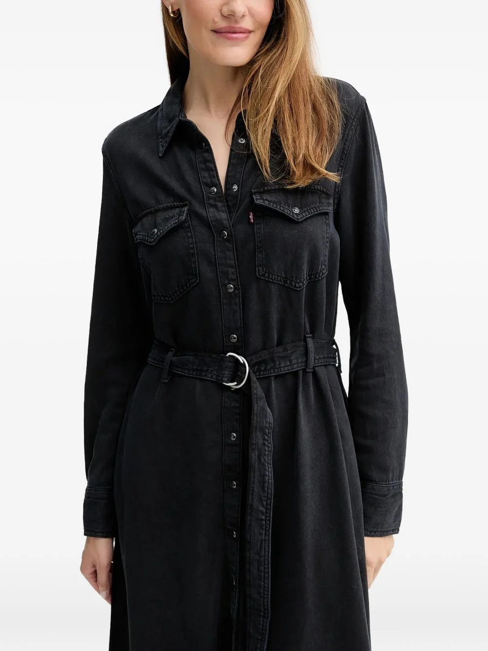 belted denim dress Highlights - Black - Front button fastening - Chest flap pockets - Detachable belt - Long sleeves Imported Composition Cotton 100% Washing instructions Read Manufacturer Guidelines