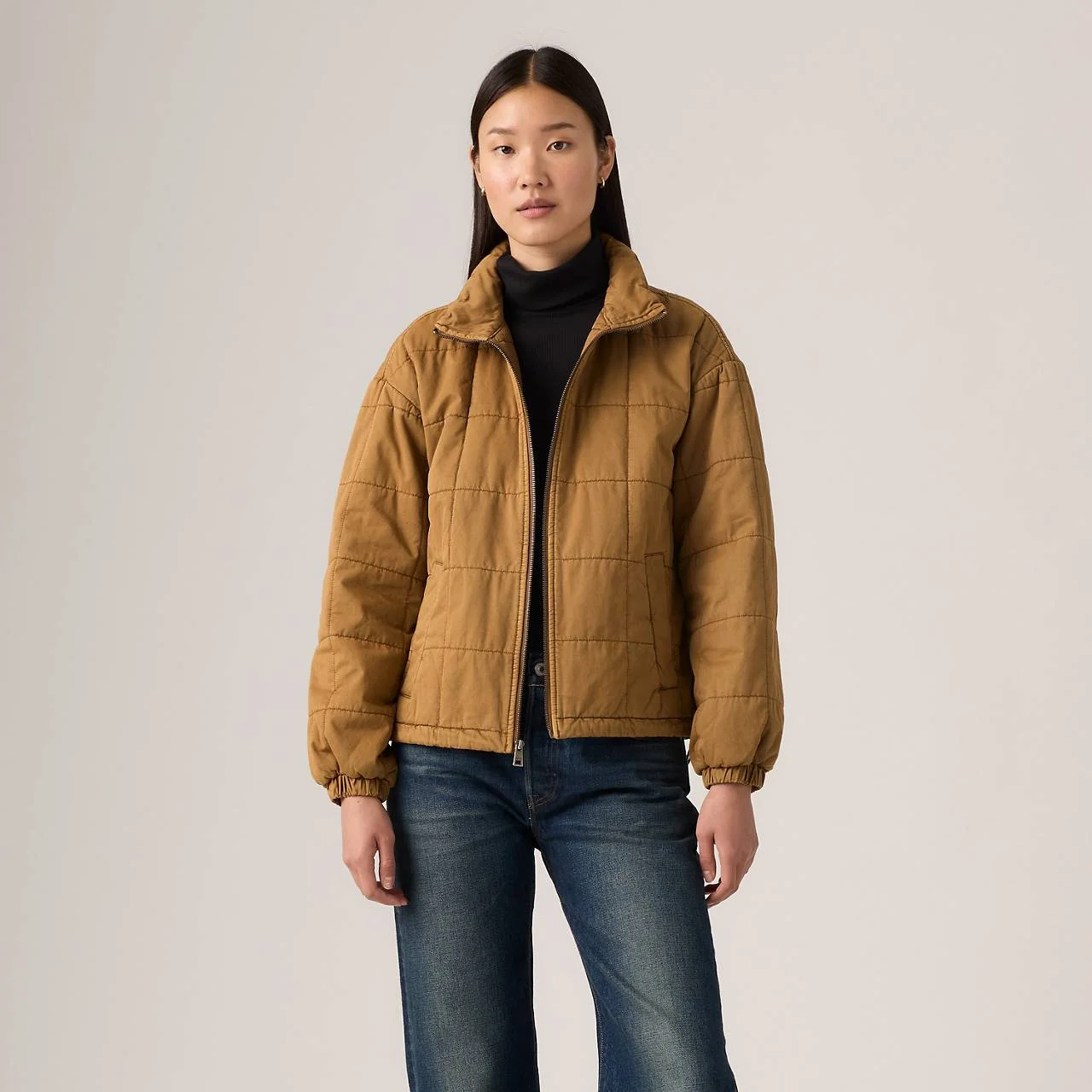 Stay warm and stylish with the Levi's® Box Quilted Relaxed Cotton Jacket. Designed with a laid-back fit and a modern box-quilted pattern, this jacket brings a fresh twist to classic outerwear. Crafted from breathable, durable cotton, it features a full front zipper, elasticized cuffs, and convenient side pockets for everyday ease. Inside, a smooth, lining enhances comfort, while an inner pocket on the left side adds practical storage for your essentials. Whether you're layering up for a chilly day or adding texture to your outfit, this jacket delivers comfort, function, and timeless Levi's® style. - Box quilted design - Center front zipper closure - Two lower welt pockets provides a tucked away space for your essentials - Adjustable bungee cords at the hem for a customizable fit Style # 595450287 Color: Tobacco - Brown How it Fits - Standard Fit - Long sleeves Composition & Care - 100% Cotton - Cotton - Machine wash cold with like colors on delicate cycle. Use only non-chlorine bleach when needed. Tumble dry low. Cool iron if necessary - China