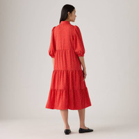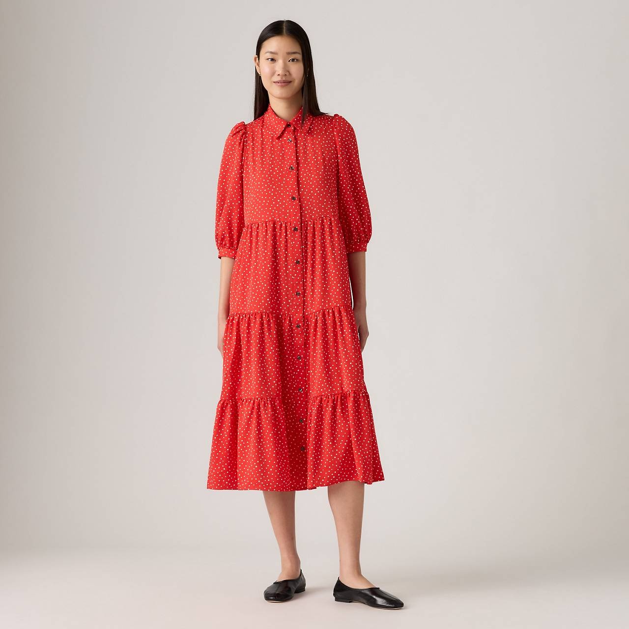 Your cottage core dreams come true. Meet our Cynthia Midi Dress: A button-down, A-line dress cut designed with a classic point collar and an of-the-moment tiered skirt. - An A-line dress with feminine details - Midi length - With a button down front and tiered skirt - We made this garment with recycled polyester fiber Style # A58440010 Color: Marlo Dot_V2 High Ri - Red How it Fits - Relaxed fit Composition & Care - 51% Recycled Polyester, 49% Polyester - Non-stretch - Long sleeves - Made in Sri Lanka