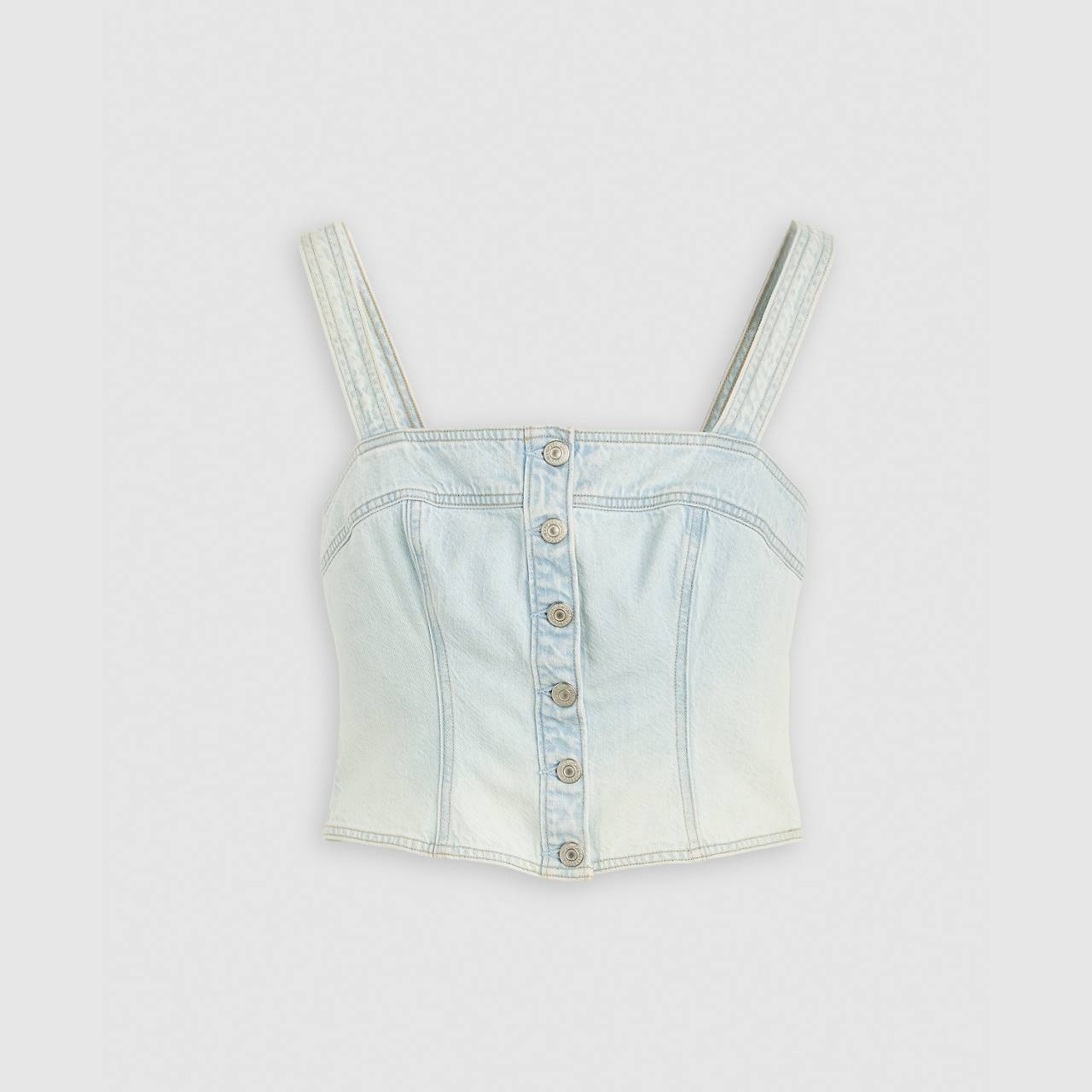 Part tank, part corset. Our Drea Tank features a cropped, figure-hugging fit, thin straps and a button-up front. To top it off, we added corset seam detailing and smocked panels for added comfort. - An ultra-flattering corset tank - Cut with a cropped, slim fit - With a button-up front - Features a corset seam detailing - Straps feature an interior button for adjustability Style # A76140007 Color: Never Going To Change - Light Wash How it Fits - Slim fit Composition & Care - 100% Cotton - Denim - Sleeveless - Imported