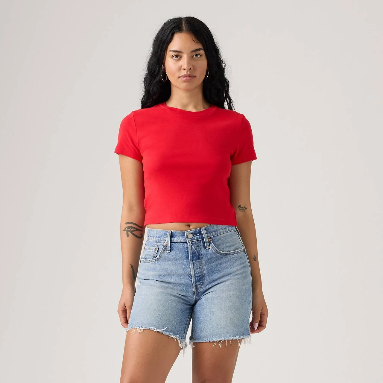 Classics like our Essential Sporty T-Shirt never go out of style. We made this one with an ultra-flattering high neckline and a fitted cropped cut—all topped off with our signature red tab. - An essential tee - With a fitted, cropped cut - Finished with our signature red tab Style # A74190032 Color: True Red Cotton - Red How it Fits - Slim fit Composition & Care - 96% Cotton, 4% Elastane - Rib Knit - Crewneck - Short sleeves - Imported