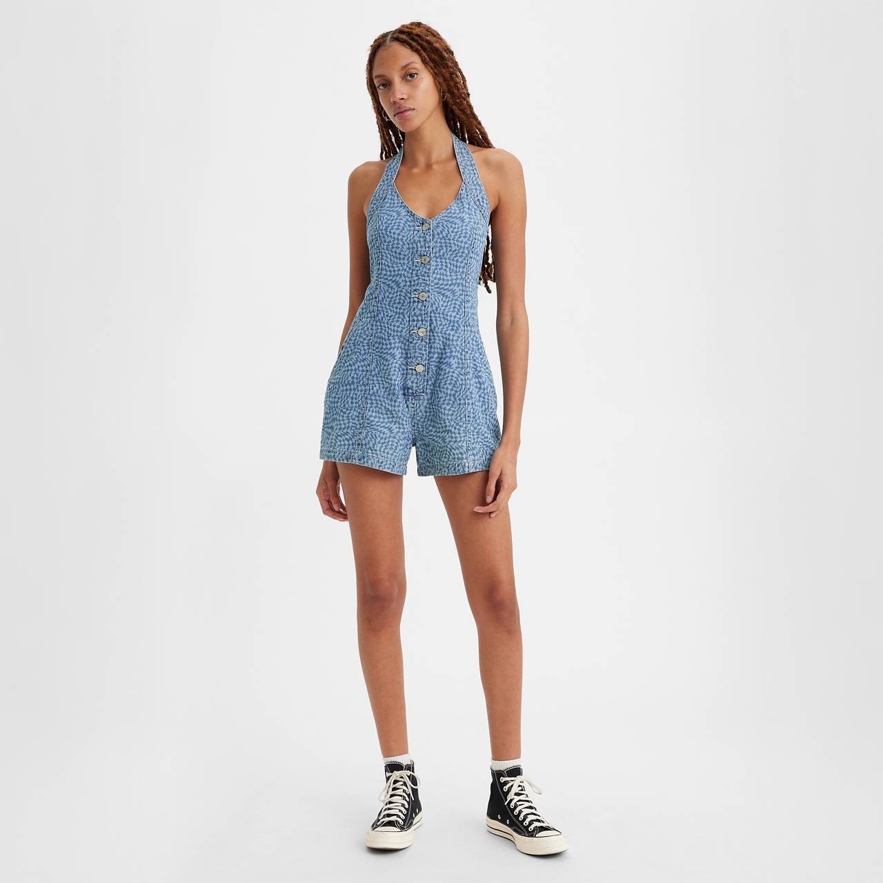 Inspired by classic '50s style, our Faris Denim Romper is designed with a halter neckline, a button down front, a figure-flattering cut and finished with relaxed shorts. And, it's made with soft and lightweight denim. - Inspired by classic '50s style - With a button-down front - Cut with a snug fit at the top and relaxed at the bottom Style # A58460001 Color: Harper - Medium Wash How it Fits - Standard fit Composition & Care - 95% cotton, 5% recycled cotton - Denim - Sleeveless - Imported