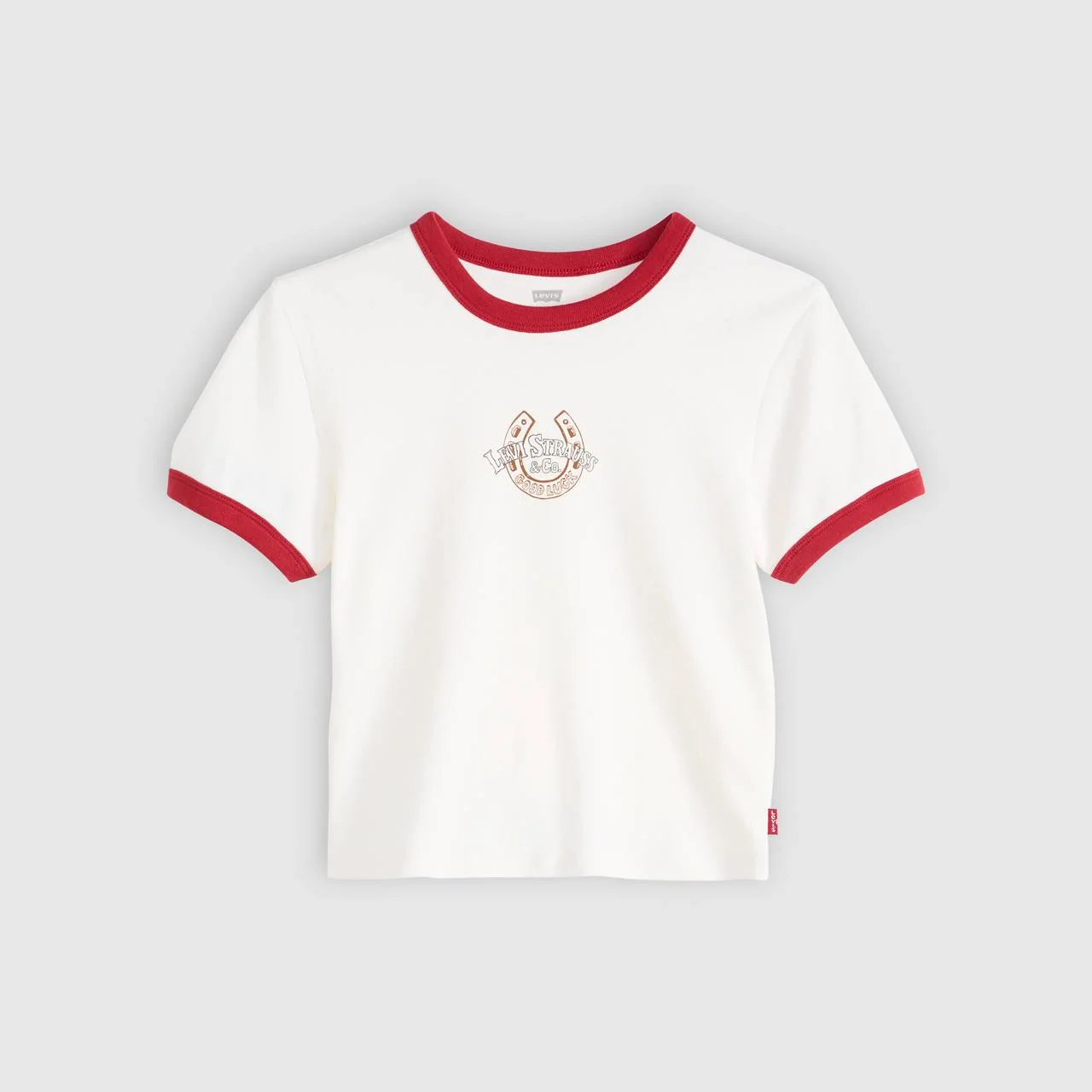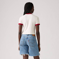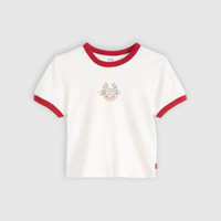 Can something be both instantly iconic and super playful? We think so. Case in point, our Graphic Mini Ringer tee. This cute crewneck pairs a cropped fit with bold Levi's® branding, thus striking that elusive balance between classic and prep. - A tiny top with maximum Levi's® style - Made with a cropped fit - Short sleeves with contrast ribbing - Embroidered with our iconic batwing logo Style # A35230134 Color: Sugar Swizzle - White How it Fits - Slim fit Composition & Care - 100% Cotton - Cotton - Crewneck - Short sleeves - Imported