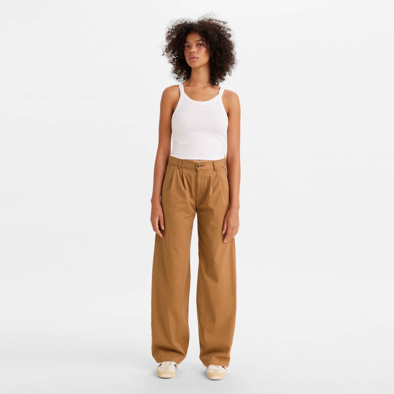 Classic, but make it fashion. We paired up two things we know you love — a curved wide leg silhouette and our signature baggy fit — for a new must-have pant. And then we topped it off by adding in some pleats and sustainably crafting them using TENCEL™. They make the perfect complement to a cropped T-shirt or tank. - Pleated trousers with a curved wide leg silhouette - Featuring our signature Levi’s® baggy fit - We made this garment with TENCEL™ Lyocell, a soft fiber sourced from sustainably harvested wood - Goes well with a cropped T-shirt or tank Style # A46920000 Color: Foxtrot - Brown How it Fits - High rise - Front rise: 11 5/8" - Knee: 24 3/4" - Leg Opening: 20" - Measurements based on size 27. Composition & Care - 58% cotton, 42% lyocell (Tencel®) - Twill - Non-stretch - Zip fly - Pleated pockets - TENCEL™ is a trademark of Lenzing AG - Machine wash cold - normal cycle. Wash inside out with like colors, do not bleach, tumble dry medium, warm Iron if needed, dry cleaning possible - Imported