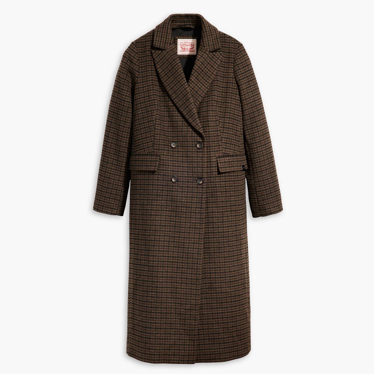 Long blazer jacket with double breasted button closure. Notch lapels, back vent and princess darts provide an elegant and elevated fit. Offers dual lower besom pockets and one inner welt security pocket. Features an anchor button on inner right side and stay buttons on both sides of interior. Levi's clamp label on left pocket flap. Style # 595460041 Color: Seal Brown Composition & Care - SHELL: 74% Polyester, 19% Acrylic, 2% Wool, 5% Other Fibers LINING: 100% Polyester - Machine wash cold with like colors, delicate cycle, tumble dry low - Imported