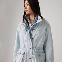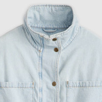 A utilitarian-inspired jacket unlike any other. Our Karlie Utility Jacket features a high collar, a button-up front, a cinched waist and four pockets. - A utilitarian-inspired jacket - With a button-up front and zipper closure - Features a cinched waist Style # 001FW0001 Color: Desert Recharge - Medium Wash How it Fits - Standard fit Composition & Care - 100% Cotton - Denim - Long sleeves - Machine wash cold delicate cycle, Do not bleach, Tumble dry low, Cool iron if needed, Do not dry clean, Wash with like colors - Made in Bangladesh