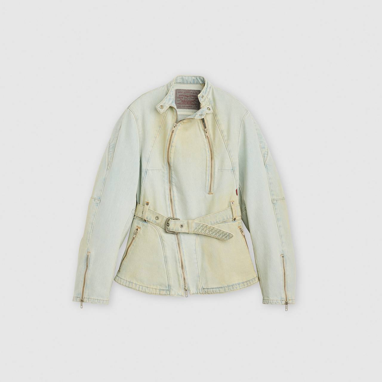 We teamed up with London-based designer Kiko Kostadinov for a second collection that reimagines classic denim silhouettes by looking to the future and the past. Designed by twins Laura and Deanna Fanning under the Kiko Kostadinov studio, these pieces take a cue from vintage postal stamps and a vintage LEJ sample that inspired the collection’s signature light indigo wash. The limited-edition Carina Waisted Jacket features a light indigo denim with specific tinted placements that create subtle variations across its non-stretch, denim canvas. Back elbow darts add sculptural volume to the sleeves, while stainless steel zippers and snap closures provide industrial functionality. A godet detail at the zipper cuff adds technical precision, and the piece comes complete with a coordinating belt. - A limited-edition belted jacket - Made with light indigo denim - Features back elbow darts and stainless steel zippers - With a godet detail at the zipper cuff - Finished with a matching belt Style # 003IR0001 Color: Light Wash How it Fits - Standard fit Composition & Care - 100% Cotton - Denim - Long sleeves - Made in Turkey