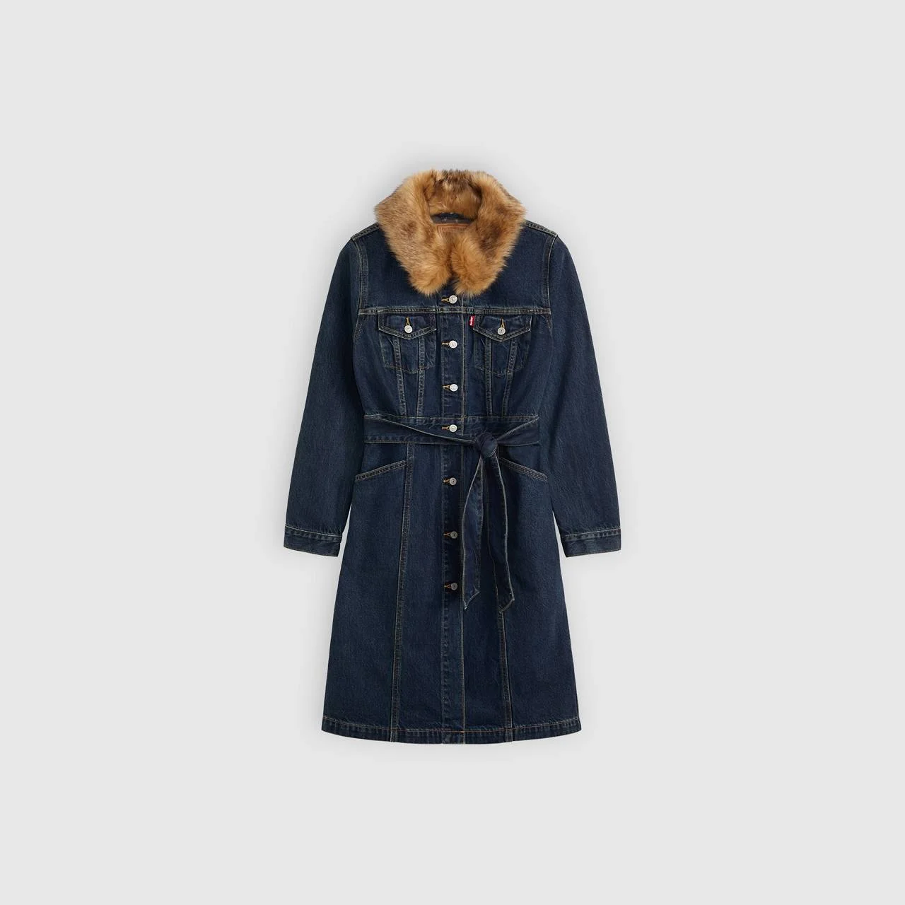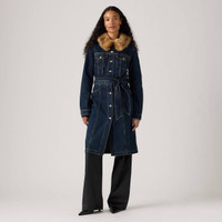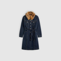 We took everything we love about our iconic Trucker Jacket and gave it a longline silhouette with a playful fur collar. This Longline Fur Trucker Jacket is designed with two chest pockets and two side pockets, a timeless button-up front and a belt so you can adjust as you please. - A longline Trucker Jacket - Cut with a standard fit - Features a removable fur collar - Finished with an adjustable belt to cinch your waist Style # 003RW0000 Color: Bellissima - Medium Wash How it Fits - Standard fit Composition & Care - 100% Cotton - Denim - Non-Stretch - Long sleeves - Imported