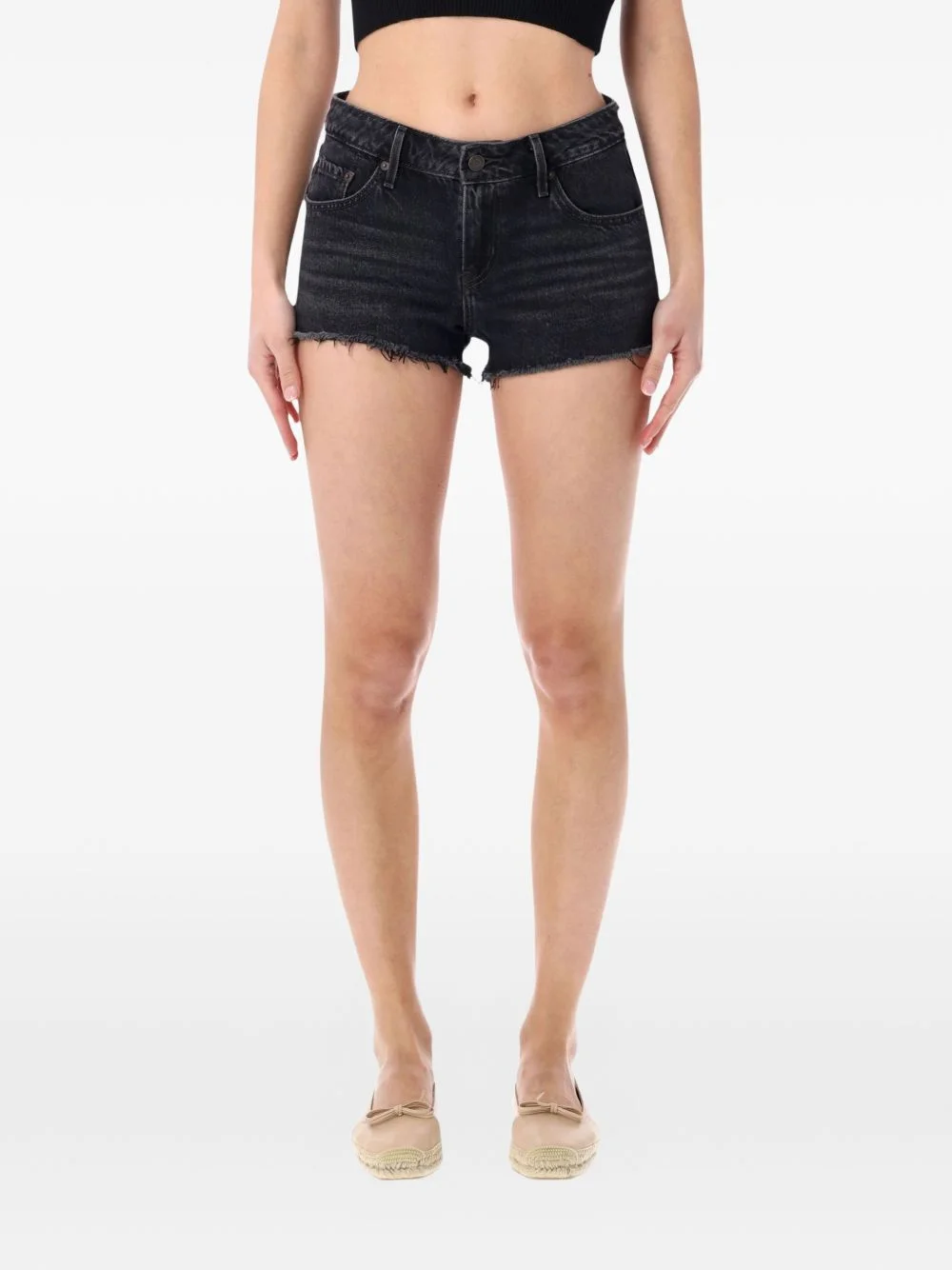 low-rise frayed denim shorts Highlights - Black - Frayed hem - Five pockets - Belt loops - Rear logo patch - Rear logo tag Imported Composition Cotton 100% Washing instructions Read Manufacturer Guidelines