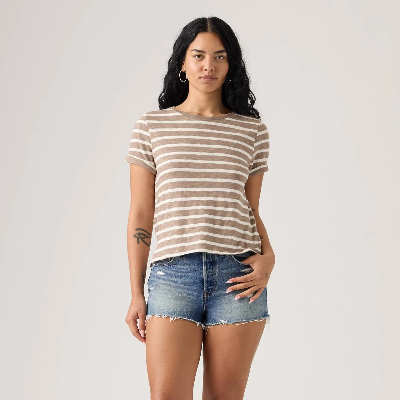 Relaxed and laidback, this Margot Short-Sleeve T-Shirt is designed with ease in mind. It features a timeless crew neckline, short sleeves and a standard cut. - A relaxed short-sleeve tee - Cut with a standard fit - Features a timeless crew neckline - Made with loose, slub fabric - With rolled sleeves Style # A72470026 Color: Taupe Gray Stripe - White How it Fits - Relaxed fit Composition & Care - 100% Cotton - Slub - Crewneck - Short sleeves - Imported