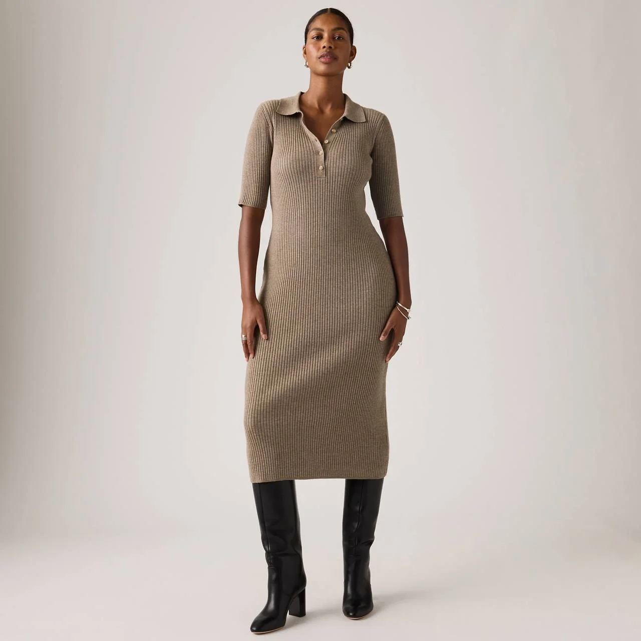 You can't go wrong with a goes-with-everything piece like our Monica Knit Dress. We gave it a flattering v-neckline, a button-up front and a figure-hugging slim fit. - A goes-with-everything knit dress - Cut with a slim fit Style # 004AM0001 Color: Taupe Gray - Brown How it Fits - Slim fit Composition & Care - 43% Acrylic, 30% Polyester, 25% Polyamide, 2% Elastane - Cotton/polyester - Short sleeves - Imported