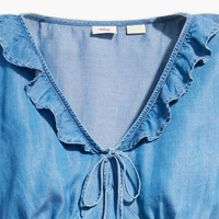 With its slim fit, v-neckline with ruffle and tie detailing and easy short sleeves, our Mylene Blouse was made for warm weather days. - A warm weather feminine top - Cut with an at-waist, slim fit Style # A76230003 Color: Vacation Mode 2 - Medium Wash How it Fits - Slim fit Composition & Care - 100% lyocell (Lenzing Tencel™) - Denim - Short sleeves - Machine Wash Warm, Do Not Bleach, Tumble Dry Low, Warm Iron If Needed, Dry Cleaning Possible, Wash Inside Out With Like Colors - Made in Bangladesh
