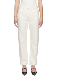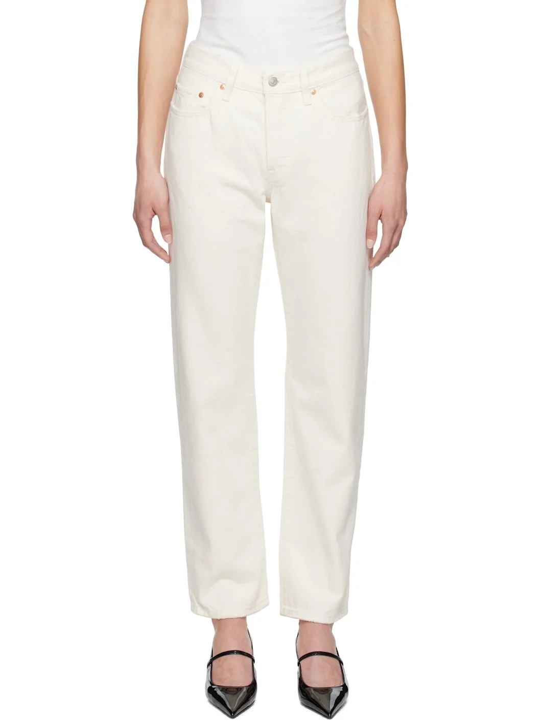 Loose-fit and straight-leg non-stretch denim jeans. Subtle distressing throughout. · Mid-rise · Belt loops · Five-pocket styling · Button fly · Logo patch at back waistband · Logo flag at back pocket · Logo-engraved silver- and copper-tone hardware Supplier color: Ecru 100% cotton. Made in Viet Nam 251099F069021