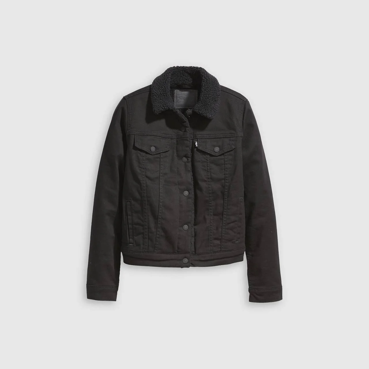 A classic with a twist, our Sherpa Trucker is a cozy take on our original Trucker Jacket that’s built with a fuzzy sherpa lining for extra warmth. This amazingly versatile staple combines the cool and the cozy all while keeping it as authentic as its namesake. - Our timeless denim jacket, upgraded with a warm sherpa lining - Soft quilted lining in sleeves - This iconic essential truly looks good on everyone, even when sized up or down - This iconic essential truly looks good on everyone, even when sized up or down - Gets better over time from natural wear with fading, stains and holes Style # 361360020 Color: Black How it Fits - Regular fit - Hits at hip Composition & Care - 97% Cotton - 3% Elastane - Twill - Stretch - Point collar - Front snap placket - Long sleeves - Chest patch pockets with snap-flap closures - Welt side pockets - Back waist tabs for an adjustable fit - Machine wash cold - permanent press cycle, wash and dry with like colors, liquid detergent is recommended, dry cleaning possible, warm iron if needed - Imported