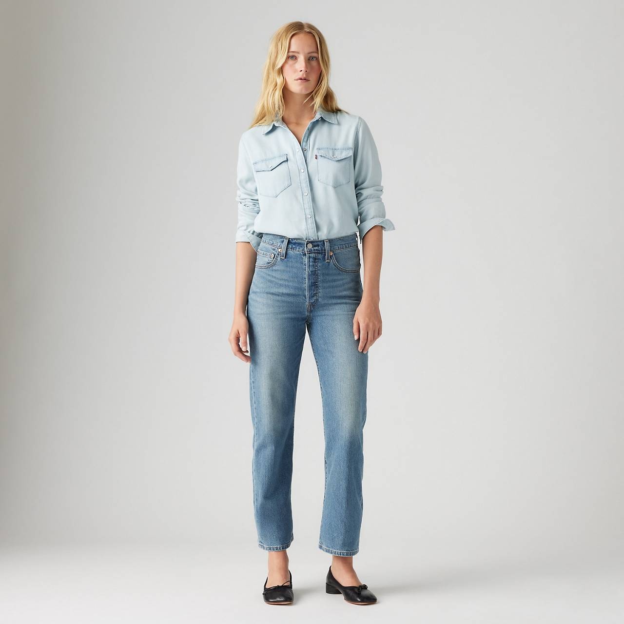 Our highest high rise yet. Our Ribcage Straight jeans—with their soaring 12-inch rise—have become a waist-defining, leg-lengthening obsession. This fit will show off your figure and make you feel as amazing as you look. - A versatile fit with a flattering high-rise - Finished with a classic straight leg - Hits at the ankle - A waist-defining, leg-lengthening obsession - Airy. Breathable. Light. This garment was made with lightweight cotton to keep you looking good and feeling comfortable. - Engineered to keep you cool and wick away moisture Style # 726930230 Color: Cool Invite - Medium Wash How it Fits - Slim Through The Hip And Thigh - Super high rise: 12 1/8" - ANKLE LENGTH - Inseam: 27",Leg opening: 17",Measurements based on size 27 waist Composition & Care - 70% Cotton, 2% Elastomultiester (T400), 8% Linen, 1% LYCRA®®, 19% Lyocell (Lenzing TENCEL™ Lyocell) - Denim - Stretch - Button fly - 5-pocket styling - Cool - Wash your jeans once every 10 wears at most; this increases their lifespan and saves natural resources.Machine wash cold, Do not bleach, Tumble dry medium, Warm iron if needed, Dry cleaning possible, Wash inside out with like colors - Made in China, Cambodia
