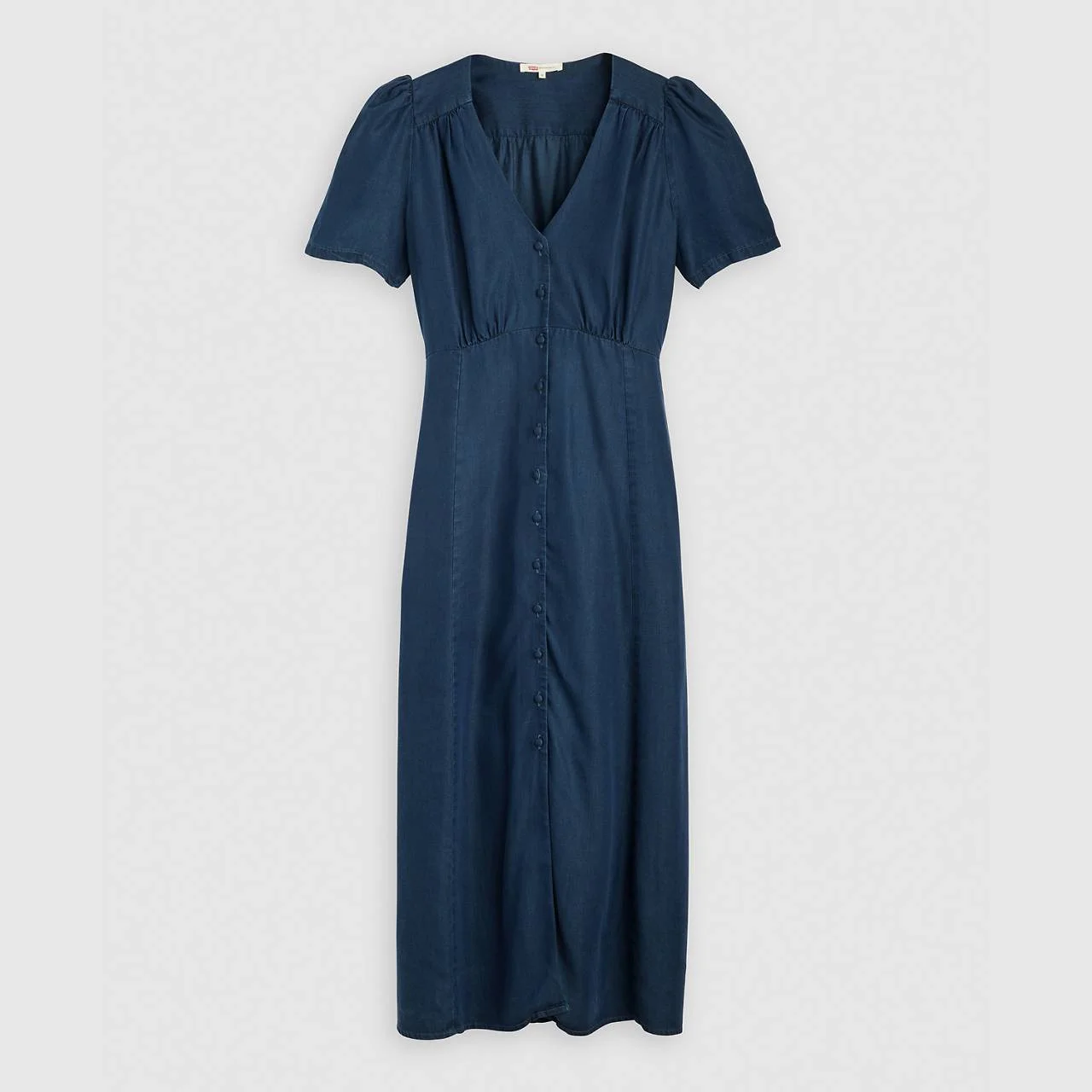 Our Sarina Short-Sleeve Midi Dress is here to make all of your warm-weather days a breeze. We designed it with a flattering V-neckline, a button-up front and an ankle-skimming length. - A versatile midi dress - Cut with an A-line silhouette - Features a button-up front Style # A86530008 Color: Initial Take - Dark Wash How it Fits - Standard fit Composition & Care - 100% Lyocell (Lenzing TENCEL™ Lyocell) - Tencel - Short sleeves - Imported