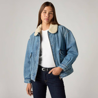 An everyday bomber jacket gets a warm upgrade. We designed our Sherpa Bomber Jacket with a a faux shearling collar, a button-up front and a loose fit. - An everyday bomber jacket gets a warm upgrade - Cut with a loose fit - Made with faux shearling to keep you warm Style # 003JF0001 Color: Turning Heads - Light Wash How it Fits - Loose fit Composition & Care - Primary Fabric: 100% Cotton; Lining: 100% Polyester - Denim - Non-Stretch - Long sleeves - Imported
