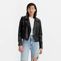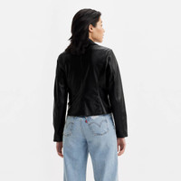 Shrunken faux leather moto. Asymmetrical front zipper closure with two lower zipper pockets. Laydown snap lapels and Levi's red tab at lower left side seam. Style # 595440334 Color: Black Composition & Care - 100% Polyurethane - Machine wash cold with like colors, delicate cycle, tumble dry low