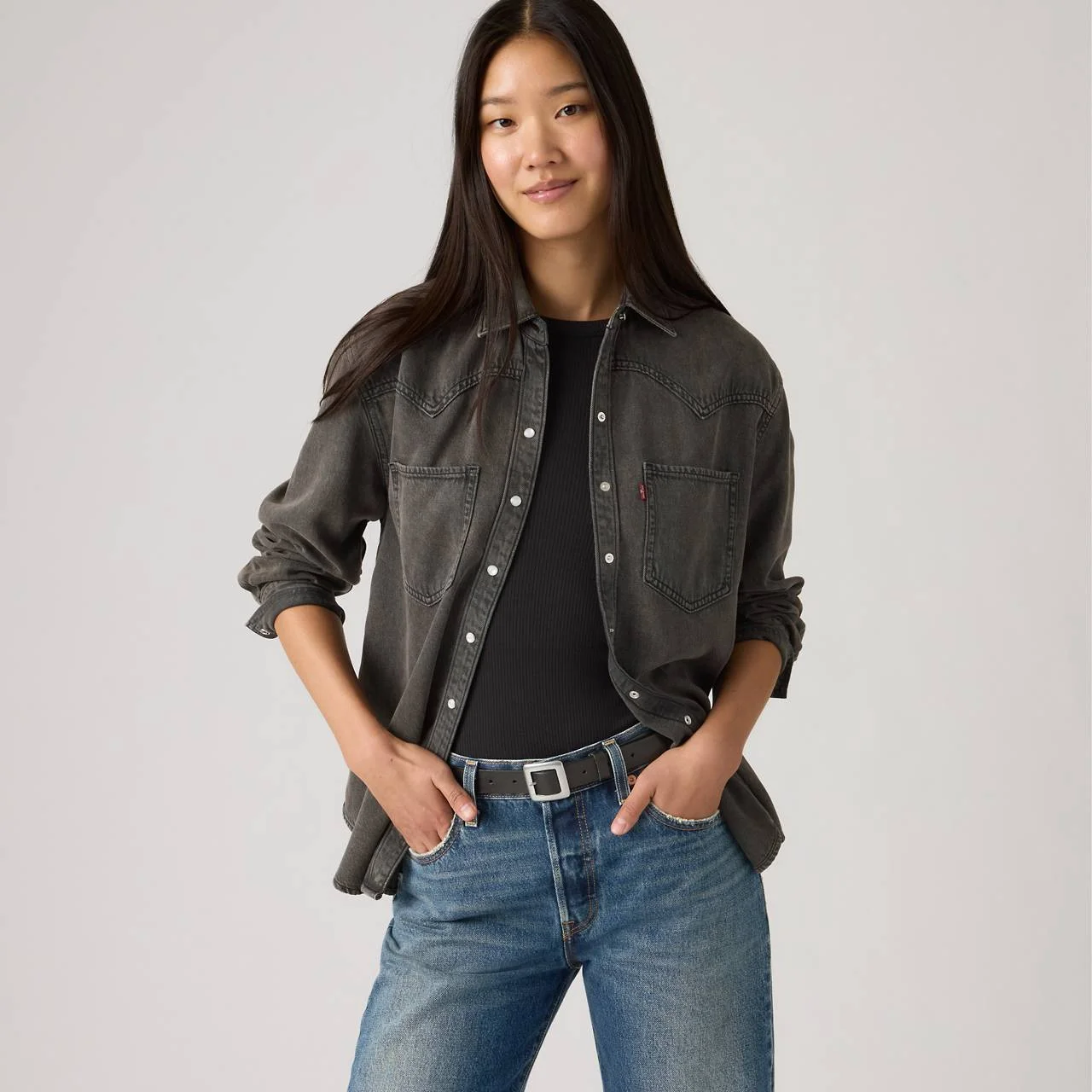 Cowboy boots not included. Our Teodora Western Shirt is a feminine take on a western staple, with a classic snap-button front, two patch pockets, a relaxed fit and a western-inspired yoke design. - A feminine take on a western staple - Cut with a relaxed fit - Features a classic snap-button front - Finished with western-inspired yoke detailing - We made this garment with TENCEL™ Lyocell, a soft fiber sourced from wood. TENCEL™ is a trademark of Lenzing AG. Style # A72440079 Color: Chipped Black Oyster - Black How it Fits - Relaxed fit Composition & Care - 100% Cotton - Denim - Point collar - Long sleeves - Imported